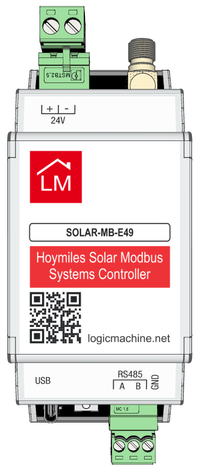 For solar energy management, we developed Energy controller with radio interface, supporting solar generation system control and energy consumption monitoring. The device works with Modbus meters (single-phase and three-phase) up to 10 units per controller, equipped with radio interface for solar inverters sub 1GHz (865 MHz) and integrated with Energy Management app in LogicMachine and Reactor.